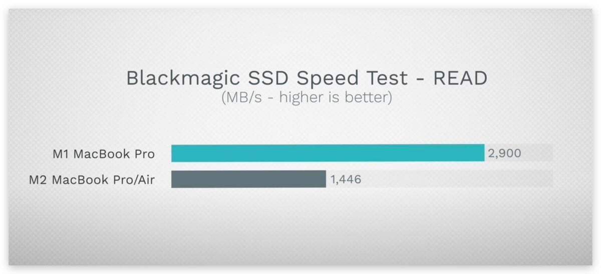 这样单颗SSD的配置就直接导致M2芯片机型的SSD读写速度比M1机型还要差,经过实测读取速度慢50%、写入速度慢30%,在当时闹出了不小的争议; 最终苹果在去年推出的 M3 MacBook Pro 中再度改回双颗 SSD 设计。