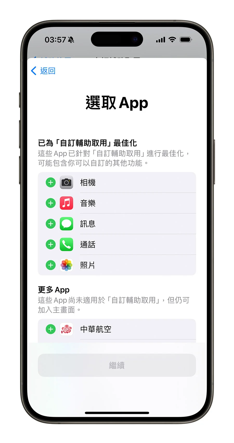 在「辅助使用」设置中的「自定义辅助取用」功能里面,可以调整要显示哪些App、外观设置、电量显示、通知等选项。