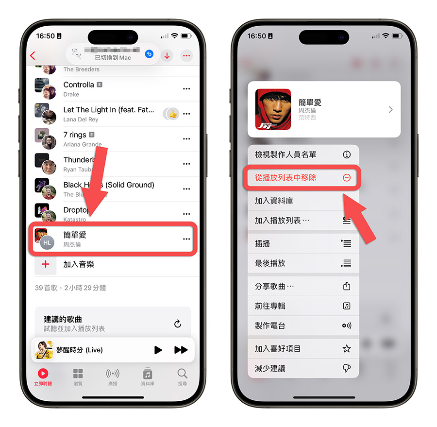 如果你想要把歌曲从合作播放清单中移除的话,一样是长按歌曲(或是点歌曲右边的那三个点点也可以),再选择「从播放列表中移除」,这样就可以把歌曲从合作的 Apple Msuic 播放清单中移除。