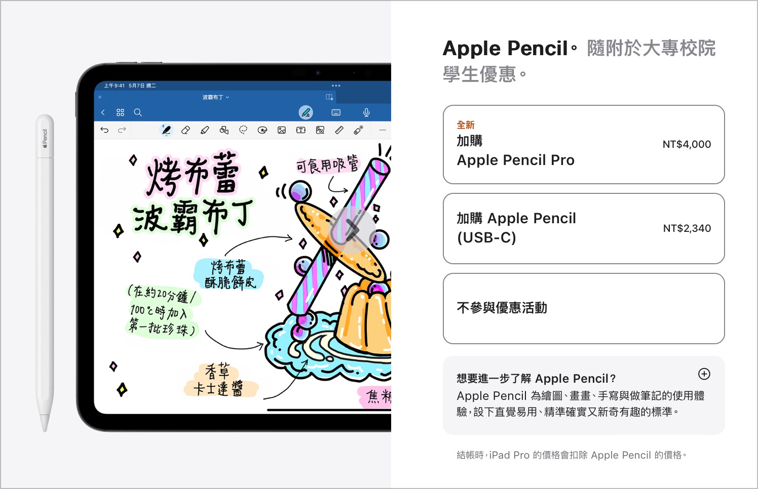 今年 Apple BTS 方案针对购买 M4 iPad Pro、M2 iPad Air 的人,直接赠送 Apple Pencil Pro 或是 Apple Pencil USB-C 版,而且是二择一直接送,不需要任何加价就可以获得高阶的 Apple Pencil Pro。