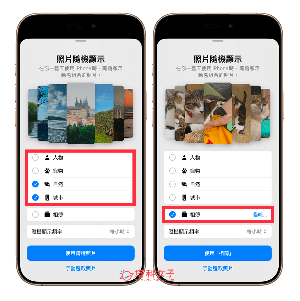 - 系统会从你的 iPhone 照片里精选出人物、宠物、自然和城市四种组合类别,可单选或多选,甚至也可以选择「相簿」,然后设置从指定相册里轮播照片。
