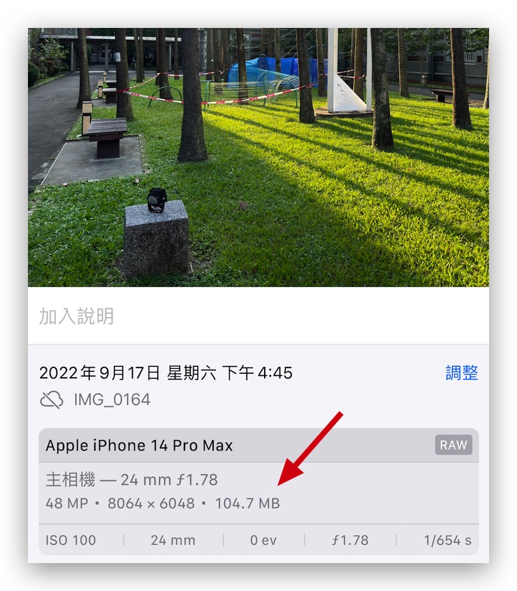 过去我们用 iPhone 拍一张 1,200 万画素的 ProRAW 照片,文件大小约在 25MB ~ 30MB;若使用 4,800 万画素来拍则普遍落在 75 ~ 80MB,甚至有可能会到 100 多 MB。