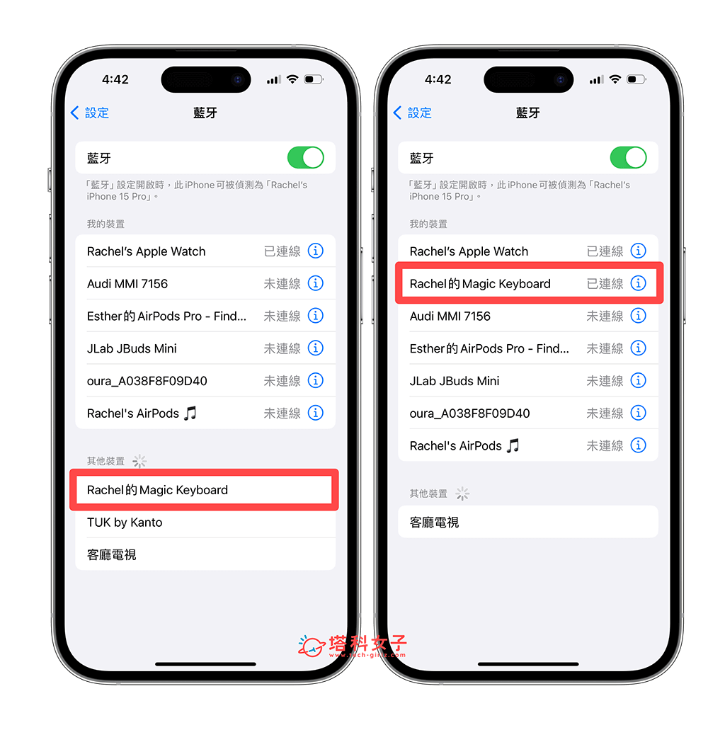 确认外接键盘已经处于配对模式后,现在我们打开 iPhone 上的「设置 app」,点选「蓝牙」,在底下的「其他装置」中,iPhone 会自动搜寻可配对的蓝牙装置,这边应该就会出现你的蓝牙外接键盘了,请直接点一下装置名称来配对,配对完成后会在「我的装置」看到它显示「已连线」,表示 iPhone 已经和外接键盘完成配对。