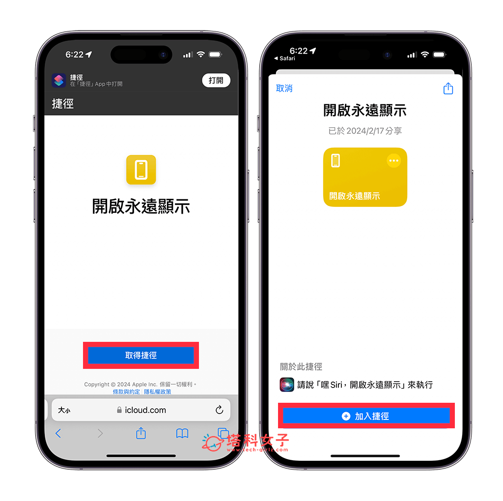 首先,请确保 iOS 内置的「捷径 App」还在,如果你之前已删除,请先到 App Store 下载回来。接着,依序下载我製作好的「开启永远显示捷径脚本」和「关闭永远显示捷径脚本」,分别都点选「取得捷径」>「加入捷径」。