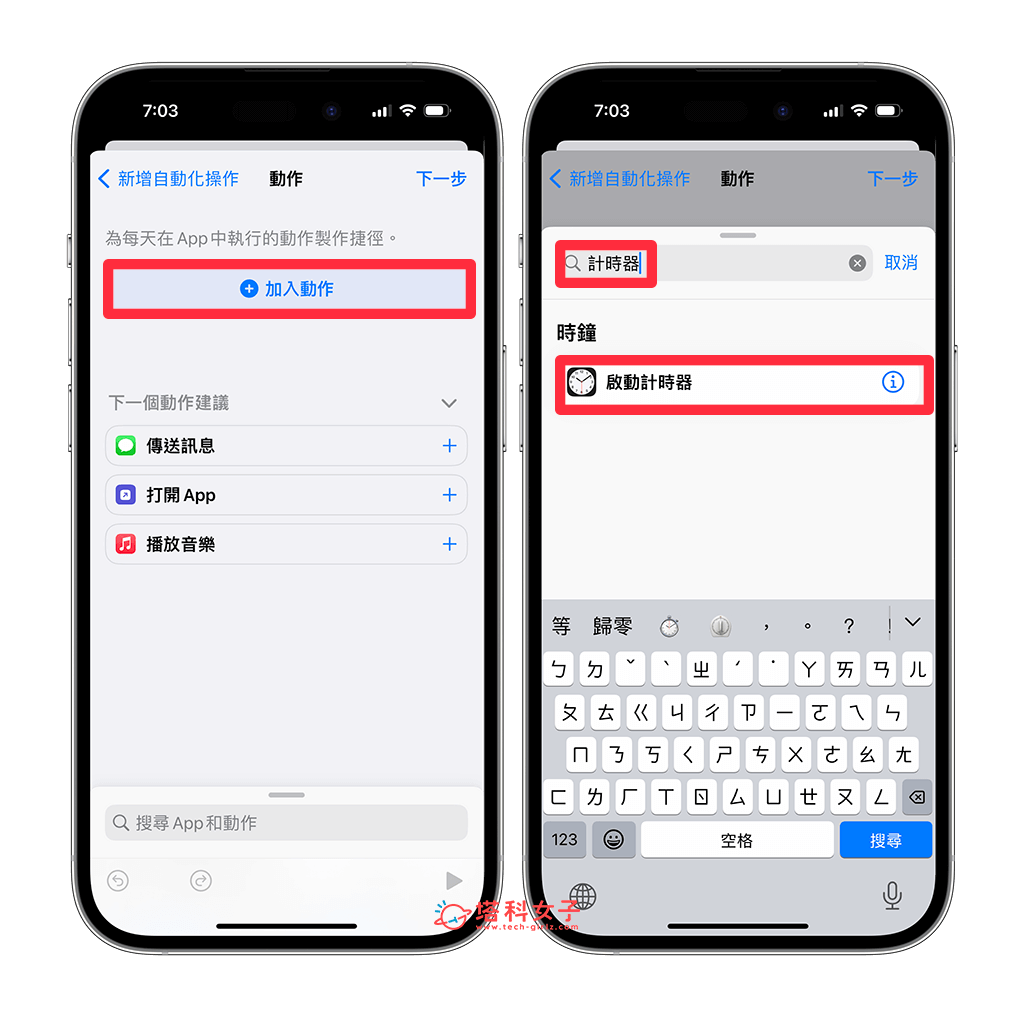 点选「加入动作」,并在搜寻框输入「计时器」,点选「启动计时器」。