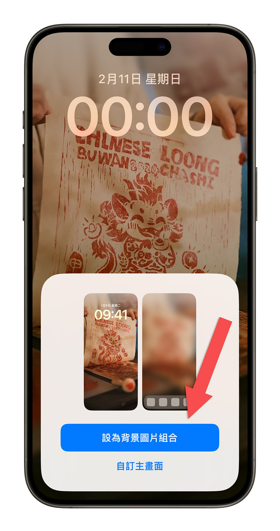 刚刚选择的 iPhone 龙年壁纸就会加入到 iPhone 锁定画面的设置中,你可以在这边调整壁纸的位置、Widget 小工具、时钟字型、颜色….等,而且每按一下就会换下一张图片,你可以一次就把所有的照片调整到适当的位置与大小。