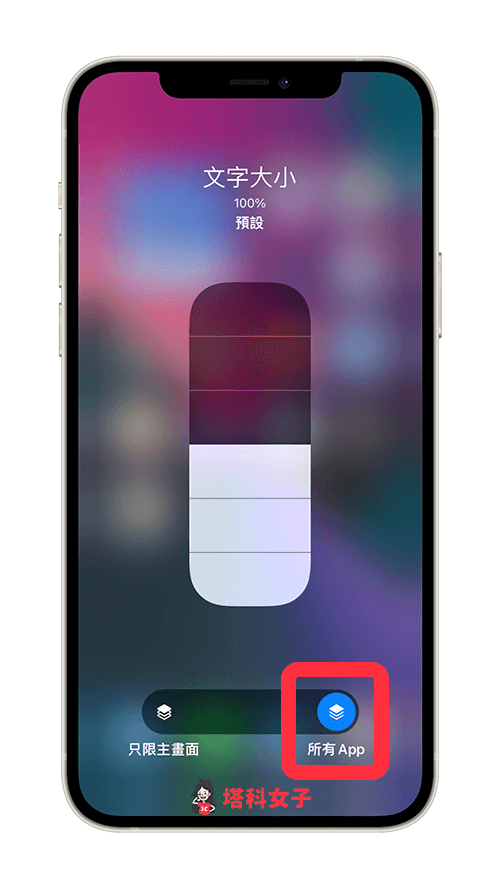 当然如果你希望能更改 iPhone 所有 App 的字体大小,那可以依照刚刚教程的方法在 iOS 控制中心上点选「AA」然后切换到「所有 App」,你所更改的文字大小就会套用到所有 App。
