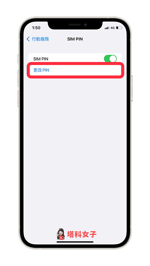 行动服务>SIM PIN”/>进到 SIM PIN 页面后,按一下「更改 PIN」。