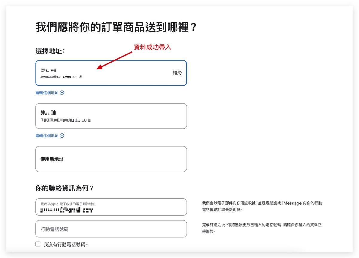 要请快递送货的话,在「运送地址」那一栏,如果你之前有在 Apple Store 买过东西并且有储存地址为预设的话,这里就会自动带出。