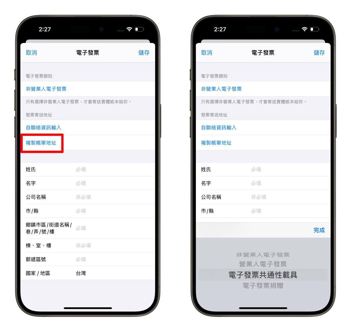 发票部分,普通用户建议「非营业人电子发票」或「载具」择一; 如果是「非营业人电子发票」可以点上方「拷贝账单地址」就会把你的数据带入,不用额外输入。