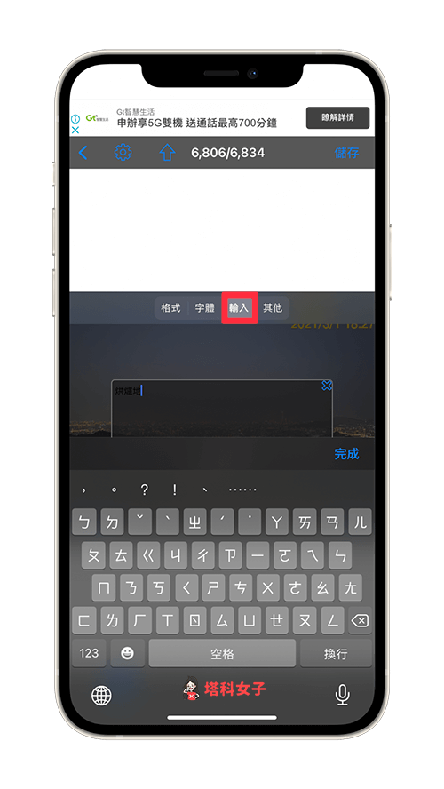 如果你希望在 iPhone 照片加上其他文字的话,那么请切换到「输入」,然后在该栏位内填上你想显示在照片的文字内容,例如你可以输入这张照片的拍摄地点。
