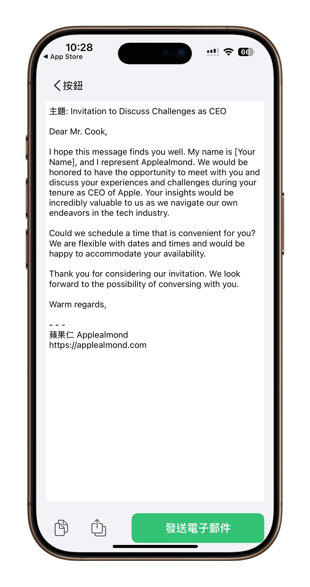 信件内容产出后,可以通过「发送电子邮件」功能,直接开启 iPhone 内的 Mail App,只要把格式重新确认,填上主旨以及收件人后就可以寄出,超级方便。