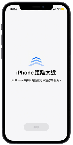 这个时候只要你把iPhone 拿在距离眼睛、脸部30 公分以上的位置,这个通知下面的「继续」按钮就会可以按,让你离开这个全屏幕的iPhone 屏幕距离警告。