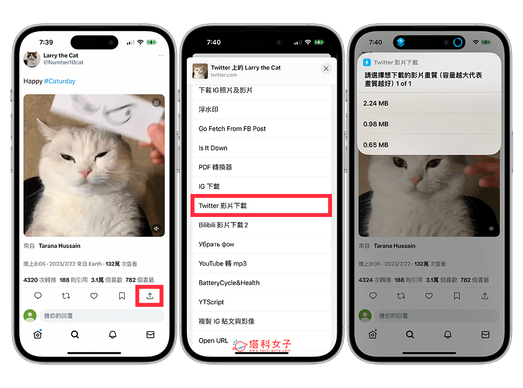 除了视频之外,我们也能下载 社交平台 GIF 档,操作方法也一样,到想要下载 GIF 的 社交平台 页面,点选「分享」,再点选「分享方式」,往下滑并点一下「社交平台 视频下载」捷径,它就会自动下载到手机相簿里面了。