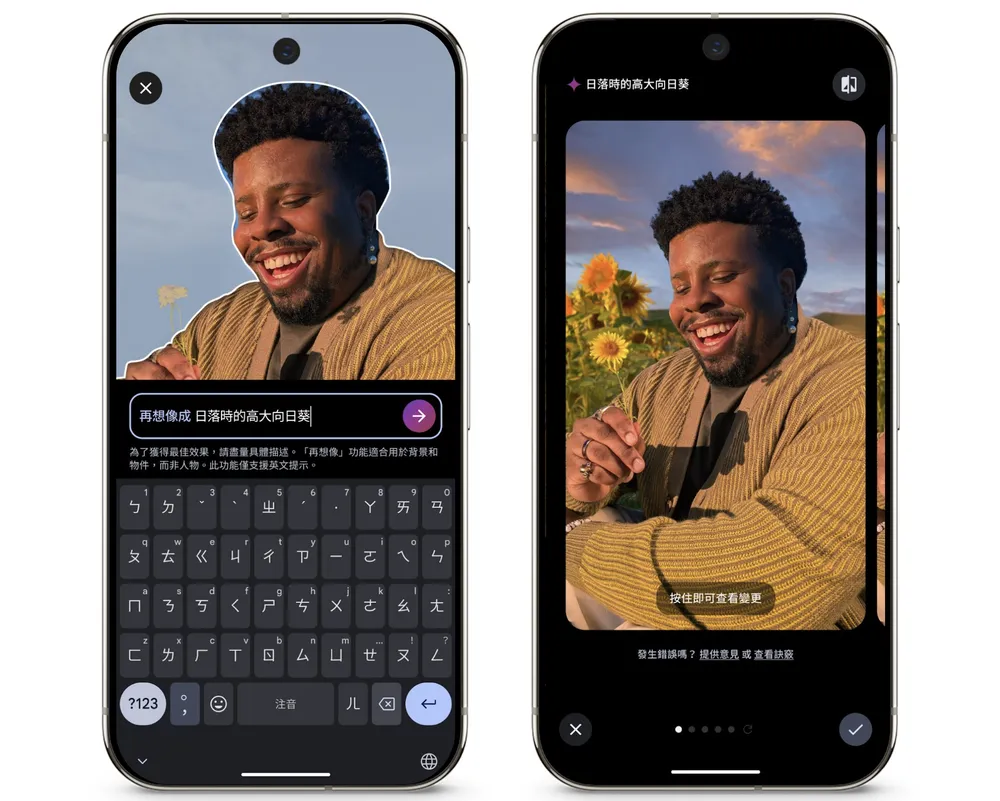 AI 部分除了「完美合照」、「魔术橡皮擦」、「魔术降噪」外,「一起拍」、「自动构图修正」以及「再想像」也有同步下放到 Pixel 9a 上。