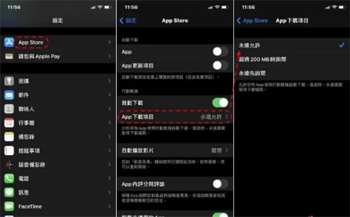 如何解除APP下载/更新200MB限制的困扰?从设置-> App Store -> App下载项目-> 改成「永远允许」就可以解除200MB的上限,另外网路没有吃到饱,或是出国开漫游的话,记得要改成「永远先询问」这样就不怕不小心按到APP更新时浪费我们的网路流量了。