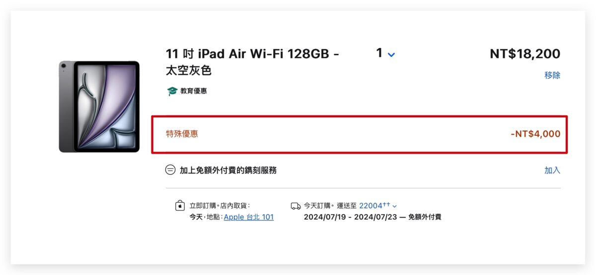 - 最后结帐前再次确认订单中是否包含主商品(Mac 或 iPad)+ 加购商品(AirPods 或 Apple Pencil)以及「促销优惠(特殊优惠)」的扣除金额。