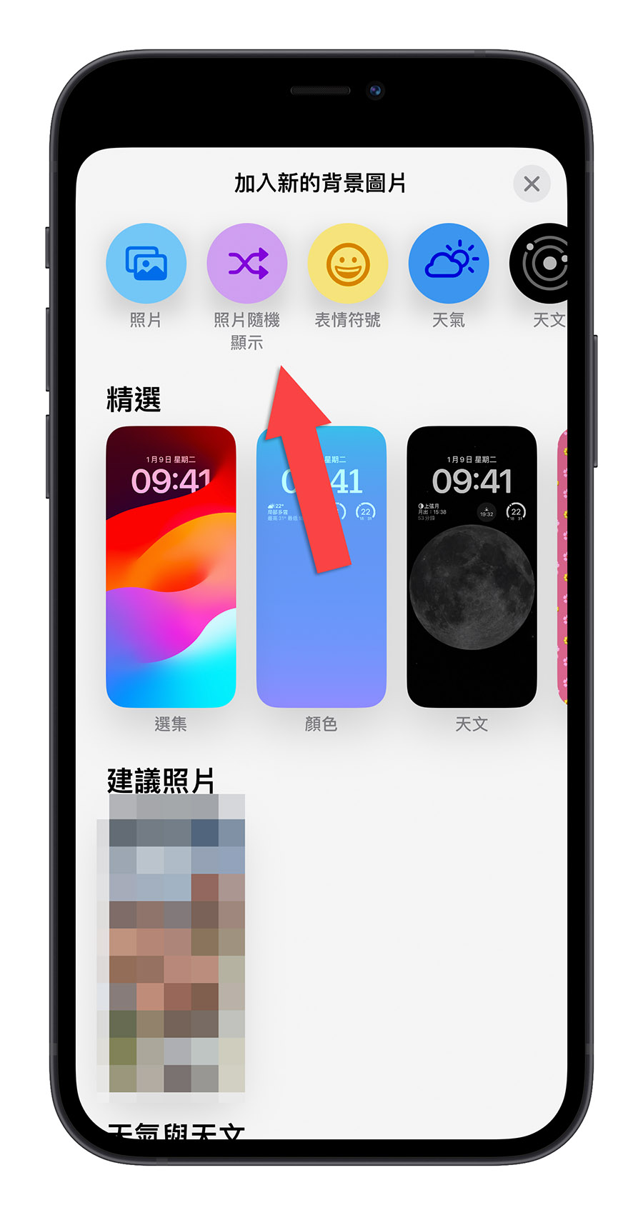 但是这里我们设置手动选取照片,自己挑选想要出现在 iPhone 锁定画面的壁纸。