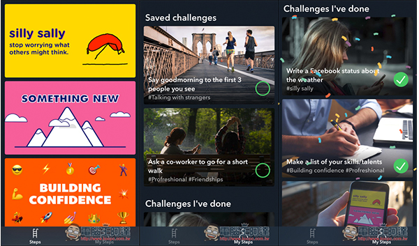 每天日子过久了,多少都会觉得无聊,似乎任何事情都差不多,不是上班下班、就是上课下课,没有什么太大的改变,有些人可能会适时安排一个长假期,好好出国旅游或做一些疯狂的事情,让生活多一点新鲜感。其实,每天做一些小挑战,也是一个很不错的方法,笔者最近就发现到这款相当有趣的「Steps: Overcome social anxiety」免费 iOS App,它提供很多小挑战的项目,从做一些不要想太多的愚蠢事、新事物、建议信心、一直到交新朋友都有,可以自由选择喜欢的,除了让生活增加更多挑战性外,长期下来,也能提升社交能力以及信心,非常值得推荐给读者们!