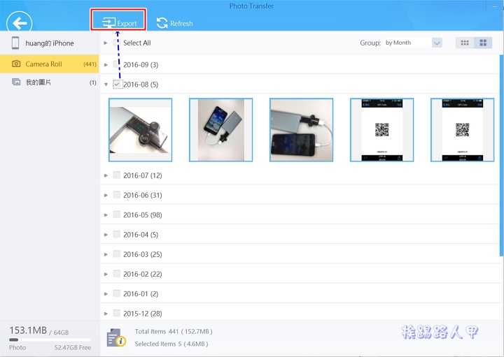 例如进入Photo Transfer画面上,勾选想要的图片后按下「Export」,即可将选择的图片複製至电脑上。
