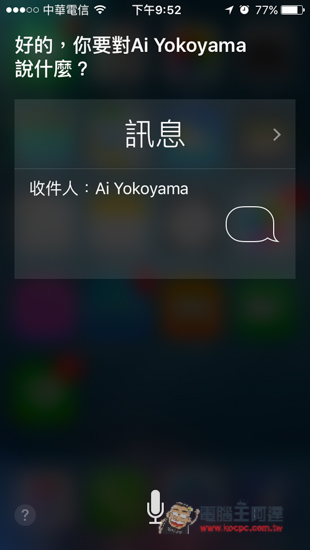 ▲ 传简讯的流程为先讲传给谁,再来说内容是什么,要不然 Siri 可能会听不懂。例句:「帮我传简讯给 Ai Yokoyama」,接着 Siri 就会问要传什么内容。