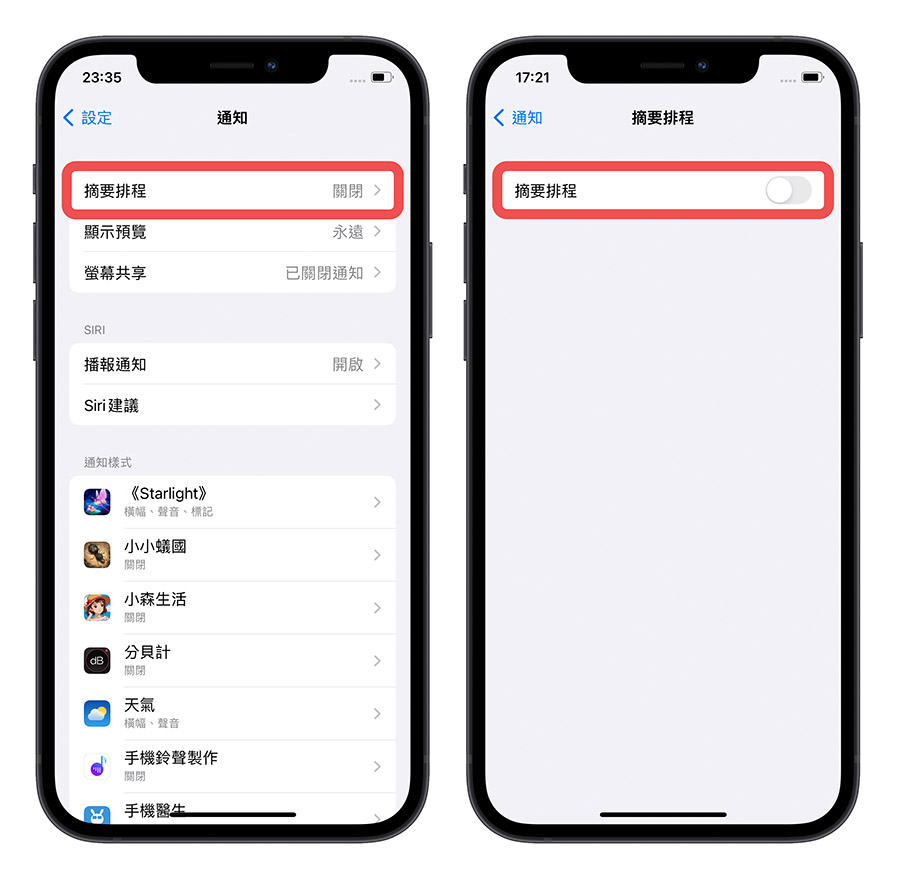 - 开启:于摘要排程时间到了才会显示在通知中心