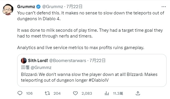 他也举先前修改内容中,离开地城传送术施展时间从 3 秒增加为 5 秒为例。 该修改对玩家来说没有任何意义,这些削弱和调长时间只是拖延游玩时数,为了利润最大化而做的分析与即时调整会毁了游戏体验。
