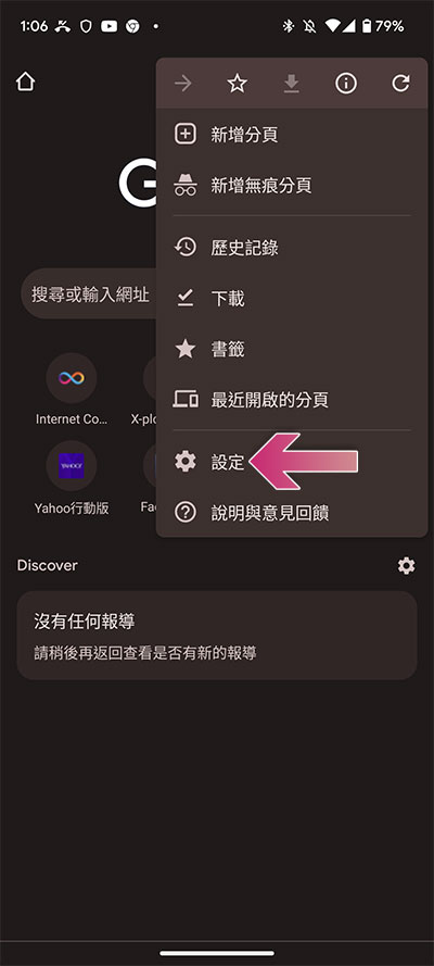 - 在 Android 手机上打开 Chrome 浏览器,点击右上角的三点菜单,从中选择「设置」。