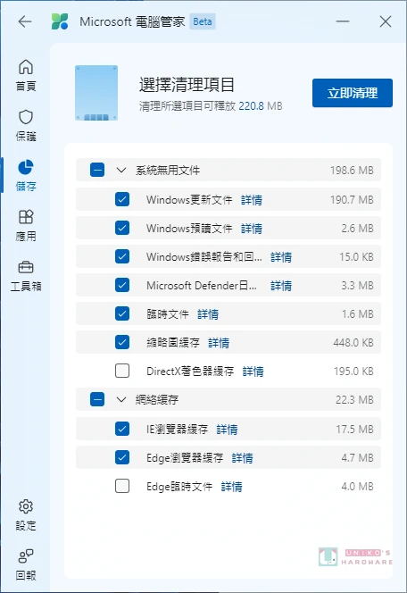 点击左侧的储存,可以进行系统清理,找出系统中非必要的暂存档并加以删除,释放磁盘空间。