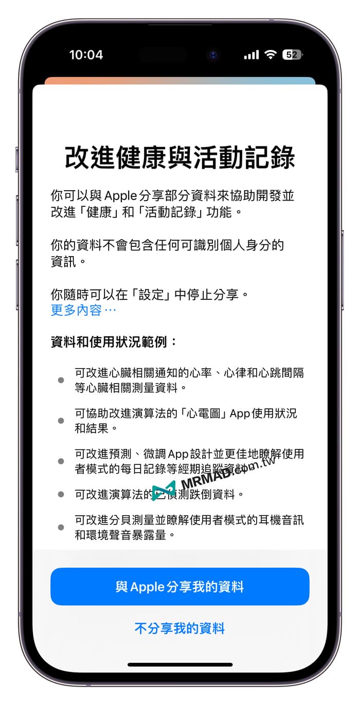 当升级iOS 17 Beta 4后,首次打开健康App会弹出「改进健康与活动纪录」提示窗,可自行选择是否要和苹果分享资料。
