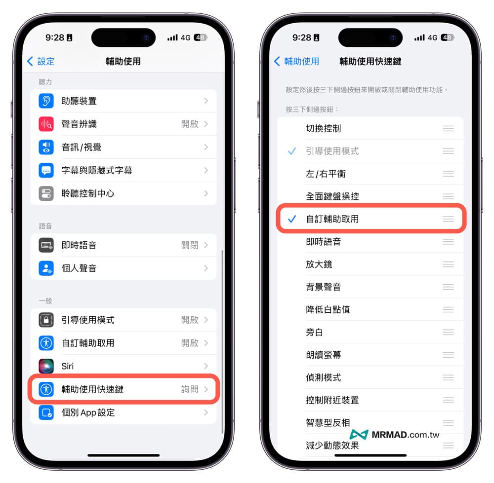 要是发现按三下iPhone电源键无法正常启用老人模式,可以到「设置」>「辅助使用」内,点选「补助使用快捷键」,确定只有勾选「自订辅助使用」功能。