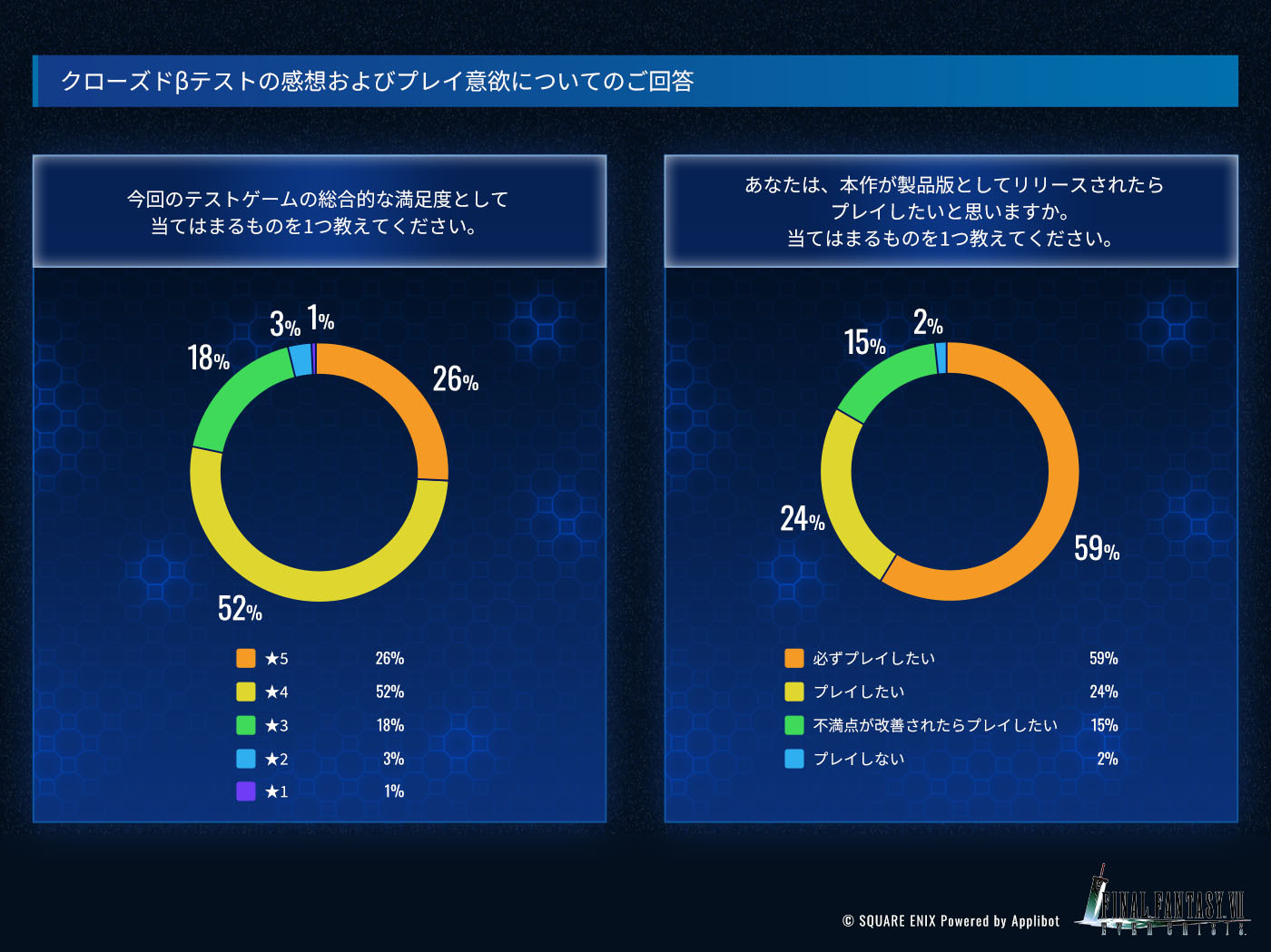 在封测的问卷调查中,有83%的玩家表示在正式上市后也会游玩《FINAL FANTASY VII EVER CRISIS》,也有很多玩家对游戏做出评价,其中代表性的意见包含「优秀的画面表现」、「符合 FF7 的世界观」、「能享受 FF7 系列作品」、「动听的音乐」、「按钮及文字偏小,选单不易使用」、「强化素材及体力不足, 不易周回」等,更多详情可以查看官方网站的封测报告。