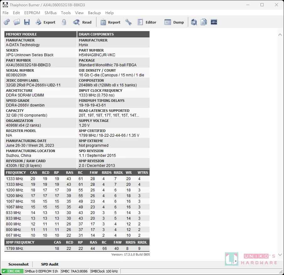 Thaiphoon 显示颗粒为 Hynix C-Die,XMP 速度可达 3600MHz,时序 18-22-22-44-66,电压 1.35V。