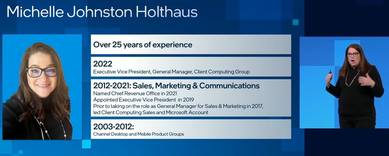 1月新上任的个人端运算事业群(CCG)总经理Michelle Johnston Holthaus,也在这场投资者说明会亮相。 她原为销售、营销与沟通事业群总经理,曾在去年台北国际电脑展的开幕演讲当中发表谈话,将接替大家熟悉的Gregory Byant。