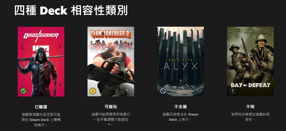 Steam Deck 兼容性等级归类一共有4种:已验证、可游玩、不支持与不明,已验证代表「游戏无须额外配置即可直接在 Steam Deck 上顺畅地执行。」 、可游玩代表「游戏可能需要用户进行一些手动调整才能游玩」、不支持代表「游戏目前无法在 Steam Deck 上执行。」 、不明则是「尚未检查此游戏的兼容性。」