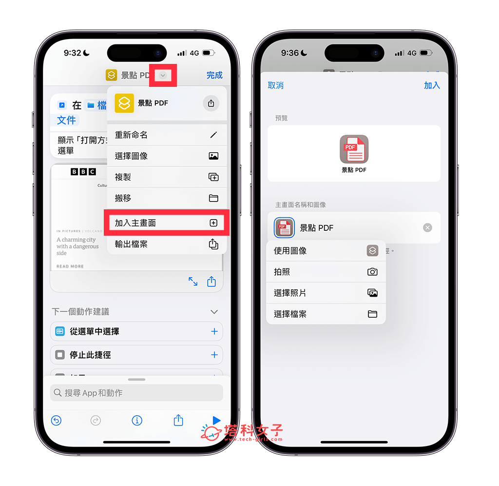 下一步,一样点选脚本最上方右边「v」按钮,选择「加入主画面」,然后你可以设置想显示在 iPhone 桌面的名称和图像,图像部分单击「小图标」后,可选择拍照、选择照片等,你也可以到网络上找喜欢的图片或 Icon 然后把它设为 iPhone 桌面文件捷径的 App 图像, 设置好之后点选加入。