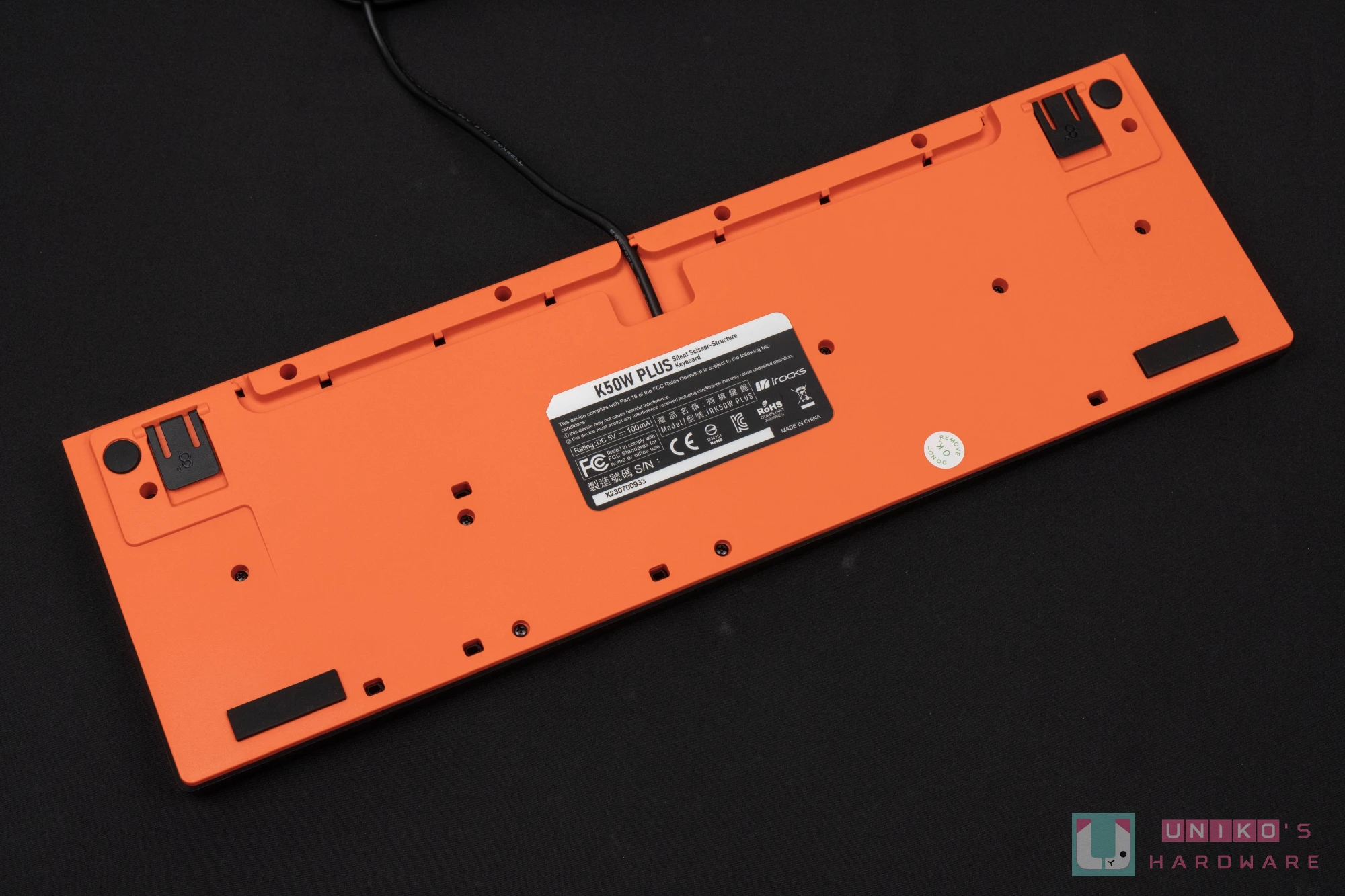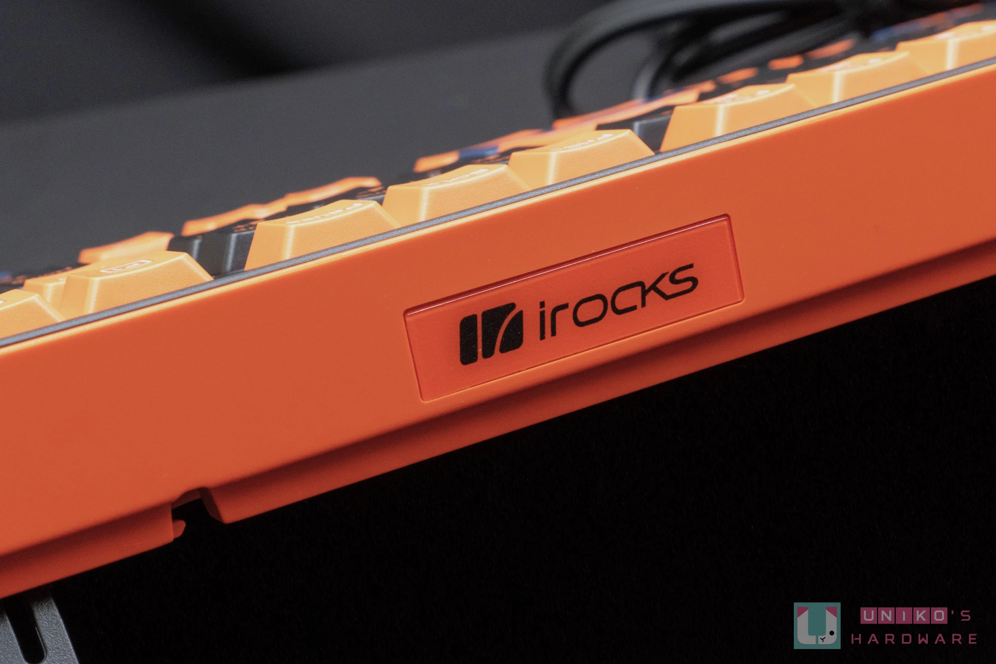 键盘顶部有 iRocks 字样铭板强化整体产品形象,键盘采用有线模式运作,Type-A 线材已直接固定在键盘上,键盘四边和脚架上都有橡胶防滑垫。