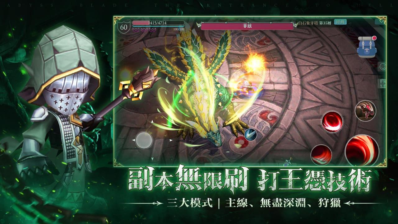 游戏内战斗模式分为「主线」、「无尽深渊」与「狩猎」三种,更有随机期间限定的副本。 可以选择SOLO单挑深渊魔物外,也可以与战友一同作战、组队冒险、加入公会、参与团战拓展好友圈。 更有各种不同 BOSS,玩家必须通过智取掌握他们的攻击套路与方式,战胜他们继续前进。