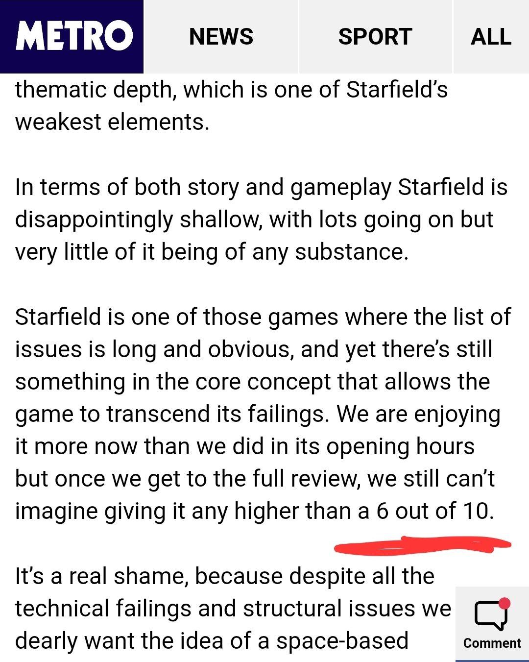 据悉,《星空》的媒体赞誉图中有一家名为Metro 的游戏媒体,赞誉图中显示Metro 的评分为5/5(满分),而实际上Metro 在官网测评中给出的分数为6分(满分10分),即使换算成5分制也是3/5。 TigerCA213 直言:「Xbox故意把它改成满分,Xbox的品牌建立在谎言之上」。