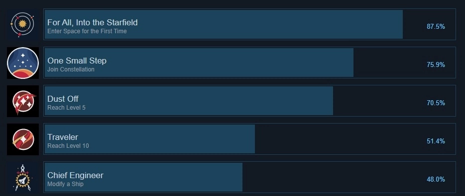 在目前成就列表中,最高达成率的「初入星域 For All, Into the Starfield」只要首次上飞船进入太空就会获得。 Xbox 达标率为74.56%,Steam为87.5%。 而其截图所展示的「一小步 One Small Step」则是加入群星组织后取得,即使拒绝也会获得。 该成就达标率分别为Xbox 55.88%Steam 75.9%。