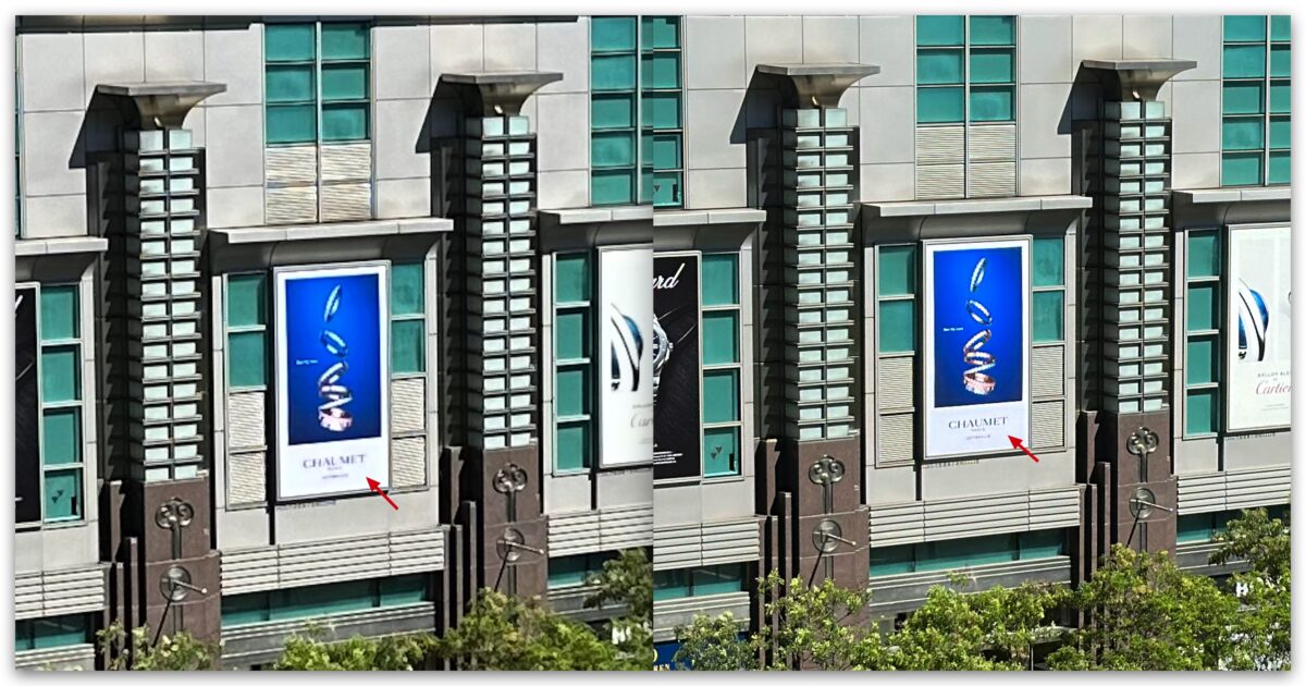 放大后就可以很直观的比较出1,200万像素与4,800万像素的细节差距,远处珠宝品牌的字体呈现明显是4,800万像素清晰很多。
