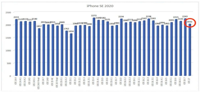 苹果已经推送了 iOS 17 正式版,依照惯例,总会出现一些新系统续航方面的问题。 对此,外媒iAppleBytes使用5款搭载iOS 17 RC的旧款苹果iPhone手机,使用Geekbench的Battery Test进行分析,了解这些手机升级iOS 17后的耗电情况。