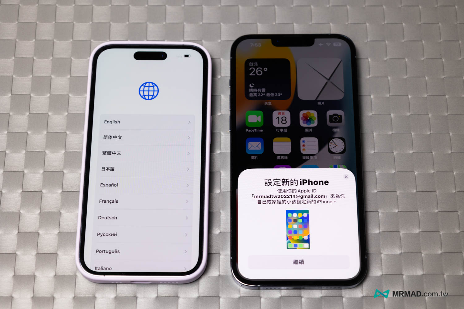 想将旧iPhone资料转移到新iPhone 15设备,只需要通过「快速开始」功能就可以实现,过程完全不需要依赖iCloud或iTunes / Finder,只要通过Wi-Fi环境,就可以将旧设备数据和内容快速搬移到新iPhone设备上。