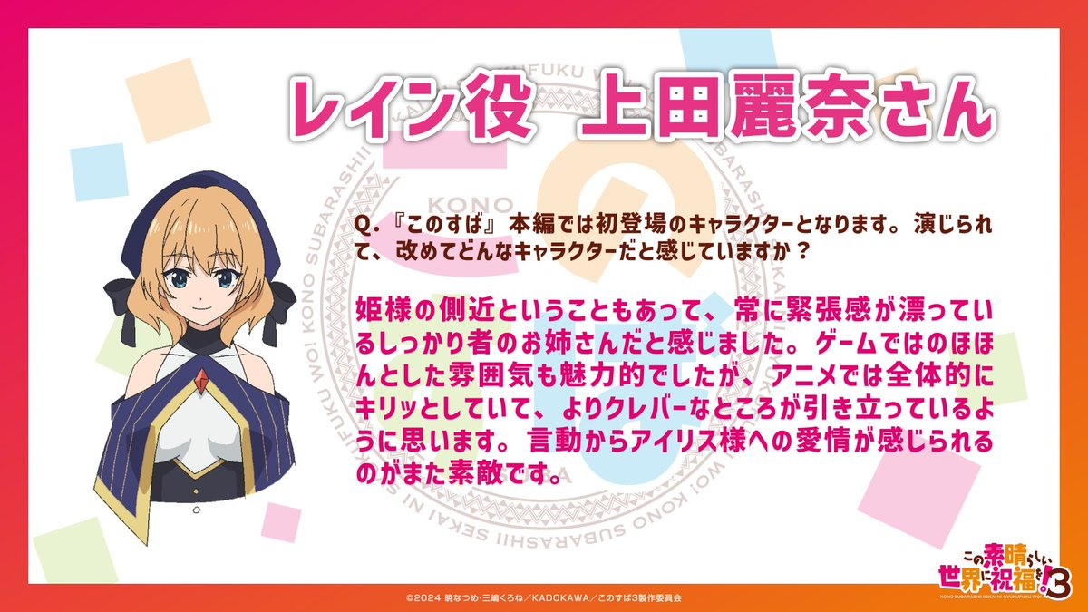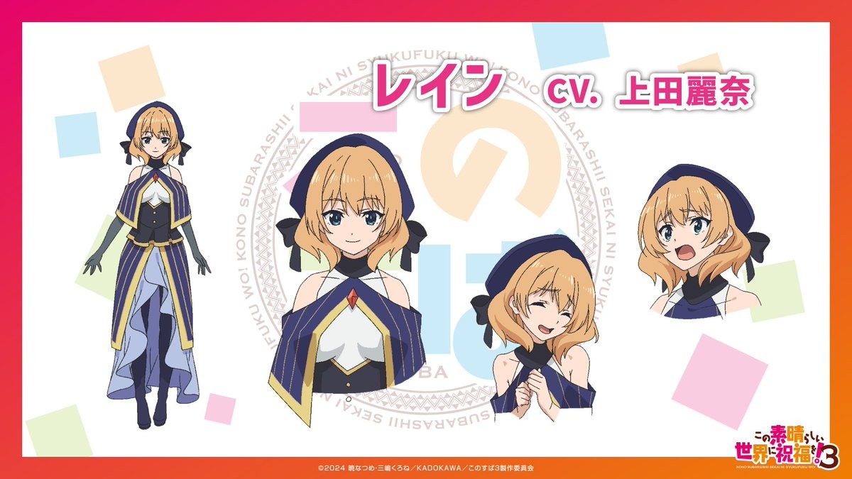 改编自由 暁なつめ 原著、 三嶋くろね 担任插画、预计自 2024 年起开始播映的电视动画《为美好的世界献上祝福! 第三季》。 官方就在 24 日这天释出动画的特报视频和追加角色&声优名单。