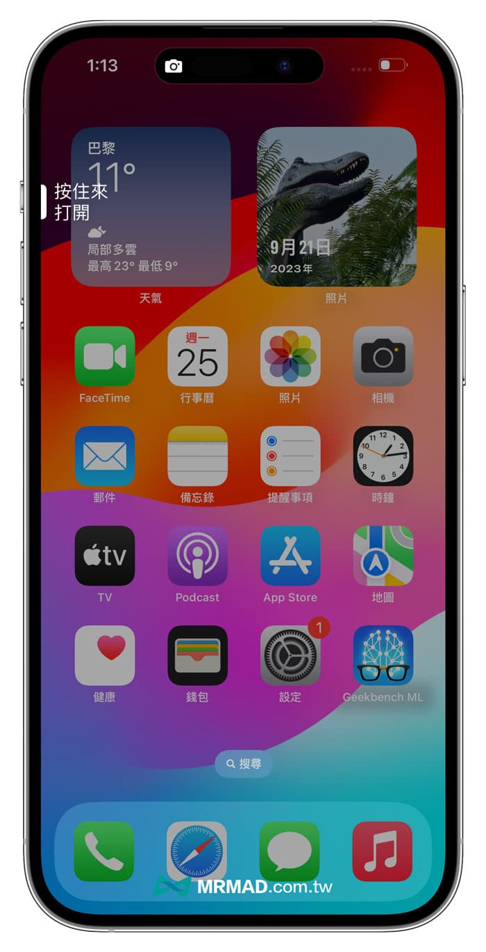不管是锁定画面或主画面想触发iPhone 15 Pro动作按钮都需要「长按动作按钮」才会启动,如果只是按压一下iPhone 15 Pro动作按钮只会在画面弹跳出提示画面,用意是显示目前所设置的快捷功能提示。