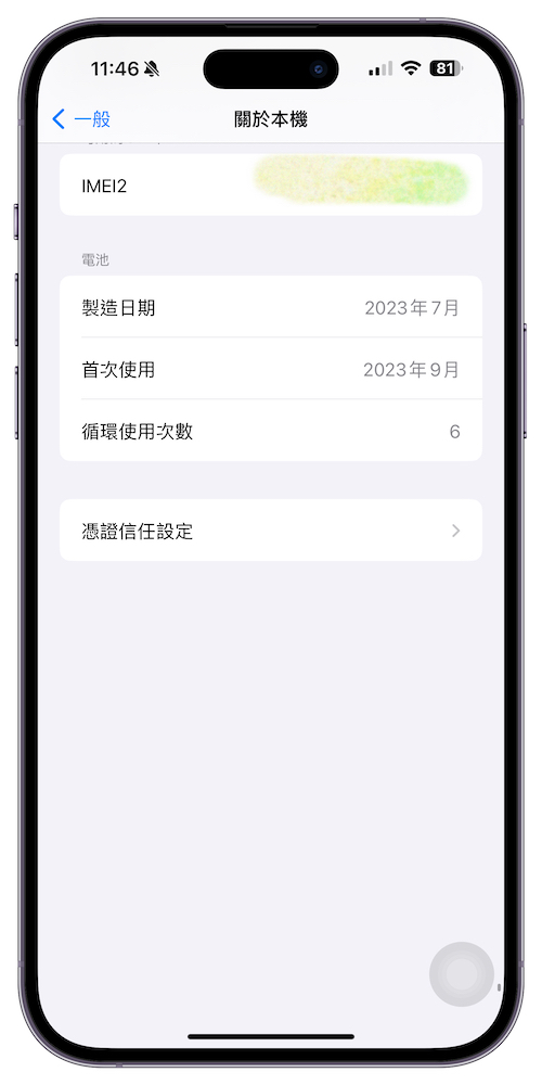 步骤 2、往下滑会看到「电池」的信息,其中包括了「制造日期」、「首次使用」与「循环使用次数」。