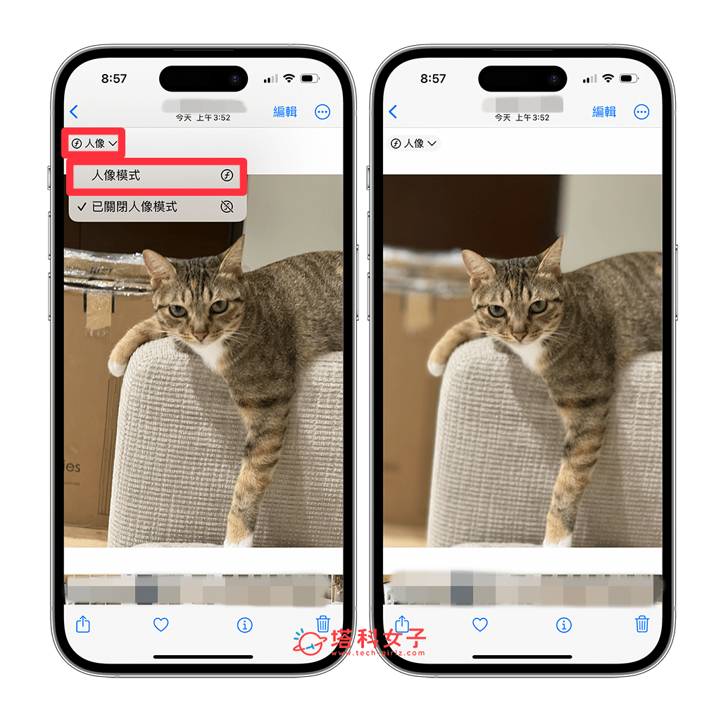 苹果也为 iPhone 15 全系列的「人像照」带来两项新功能,如果你在拍照的时候忘记切换到人像模式,那也没关系,当 iPhone 侦测到你拍摄的主角是人、小狗或猫咪时,那它会自动撷取深度信息,我们可以在拍完照后点一下左上角的「人像」,把它改为人像模式,这样你就可以获得一张背景模糊具有景深效果的人像照。
