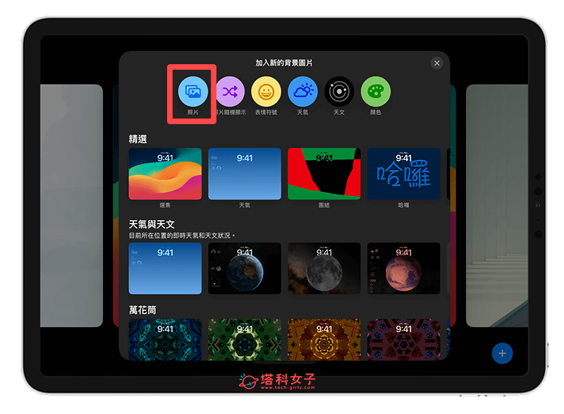 这边有许多 iPad 内置提供的壁纸样式,我们点选「照片」。 (如果想使用 iPadOS 17 内置的动态壁纸,可以选择「天气与天文」类别里的壁纸,它们会呈现目前你所在位置的实时天气和天文状况。 )