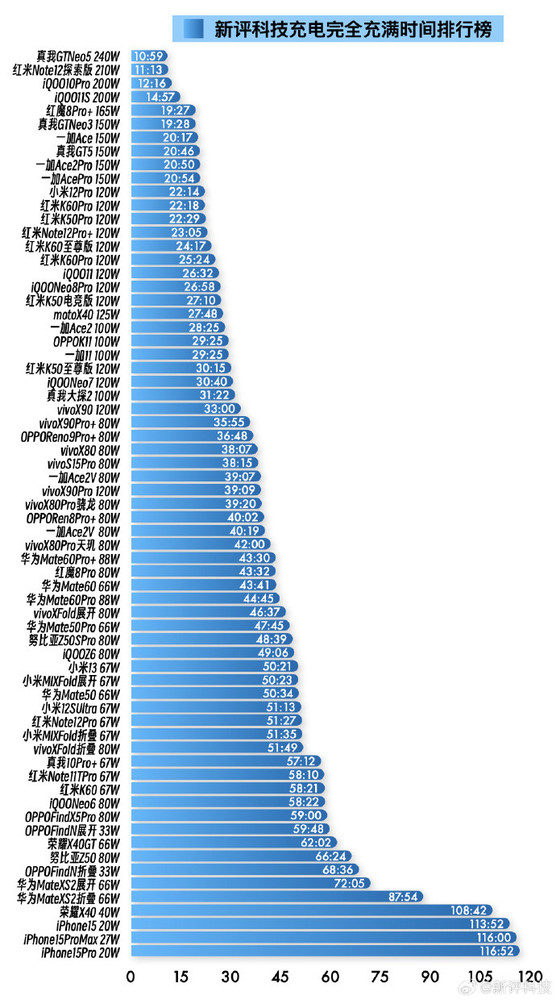 - iPhone 15 1小时53分52秒完全充满,排名第65