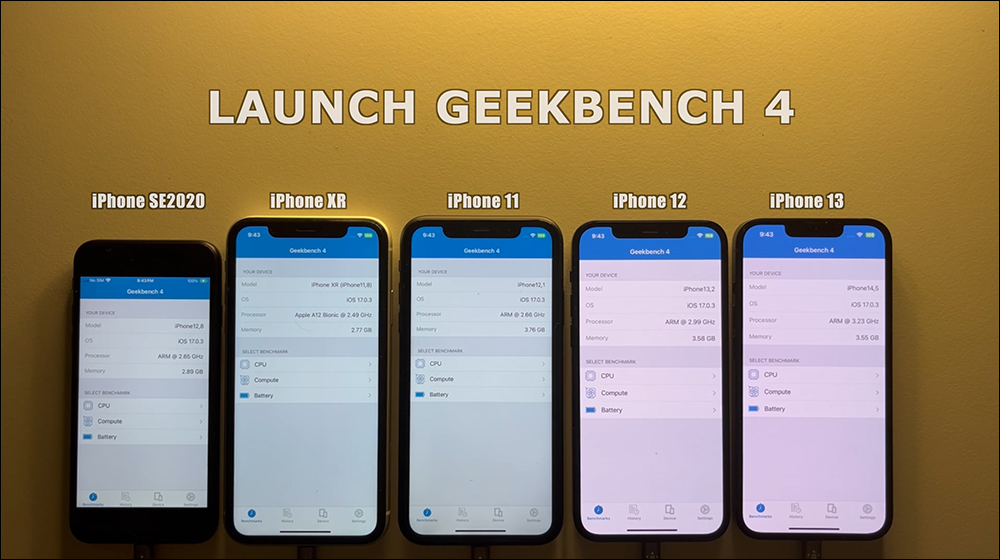 最终测试出来的续航时间如下,iPhone SE(第2代)为3小时32分钟、iPhone XR为5小时32分钟、iPhone 11为5小时37分钟、iPhone 12为5小时31分钟、iPhone 13为7小时07分钟。
